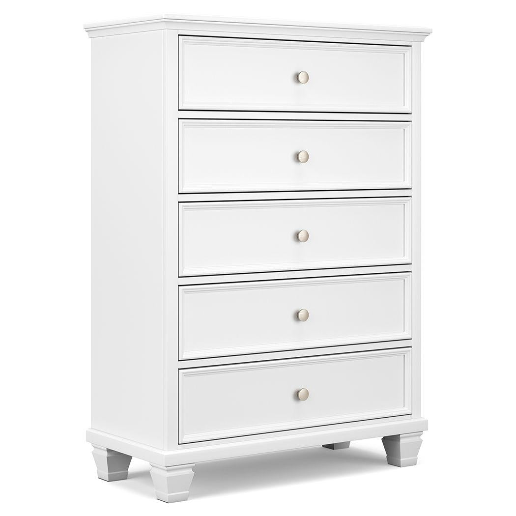 Exuding a timeless casual design, this chest of drawers is ready to define your personal space. It easily adapts to a variety of interiors, combining a clean, contemporary white finish with framed drawer fronts and round metal knobs. Featuring five storage drawers with dovetail construction and traditional tapered feet, this piece is sure to bring elegant simplicity to your bedroom.