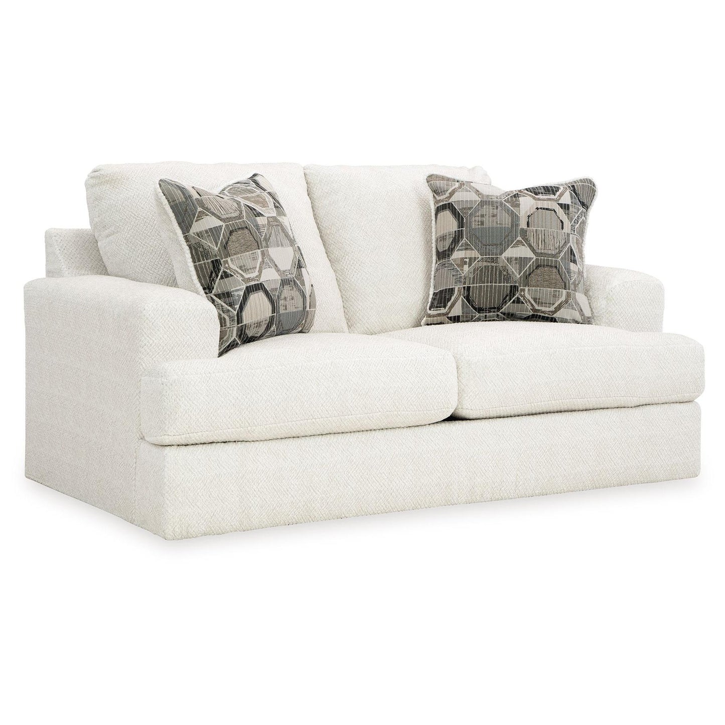 Craving casual refinement? This loveseat has you covered. Its decidedly contemporary frame cradles sizable cushions in an ultra-soft neutral hue, lightening the mood in your living room with simple style and everyday comfort. Solid and geometric accent pillows perfect the chic-meets-cozy vibe.
