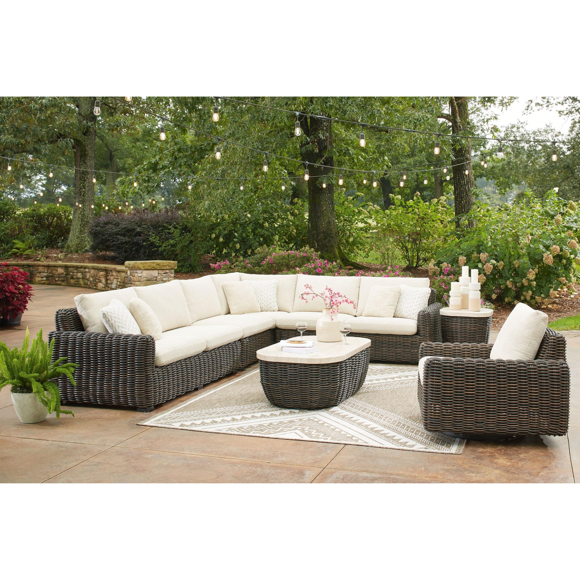 Add luxury, comfort and durability to alfresco fun. The Kimora outdoor furniture package captures the textural beauty of wicker while withstanding the elements, from rain to shine. With a UV-resistant design, the wonderfully low-maintenance Nuvella+™ fabric maintains its good looks over time. Deep, roomy seating completes the set, offering ample space to sprawl out.