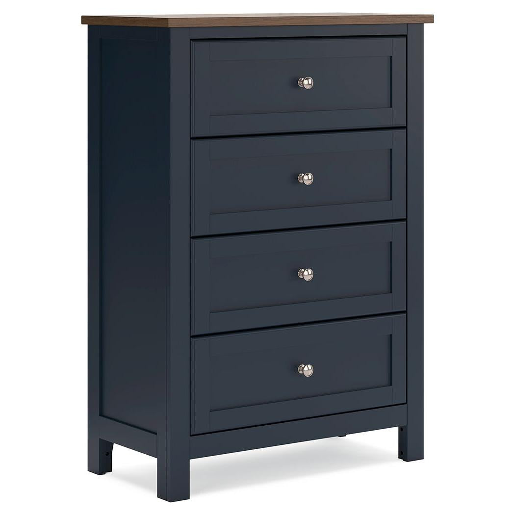 Add homespun charm to your restful retreat. A modern take on a timeless silhouette, this chest of drawers pairs a dark slate blue finish with a light brown top. Drawer fronts and legs in a classic Shaker style bring an air of beautiful simplicity to the bedroom. Whether it's part of a charmingly curated guest suite or a casually carefree kids room, this chest is a welcome addition.