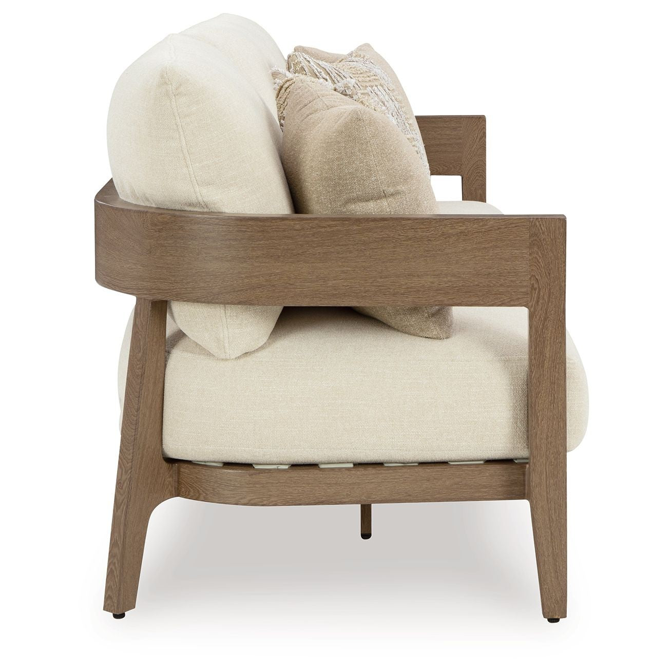 Elevate the appeal of easy-breezy living with this outdoor sofa. Made to look like wood yet durable enough to weather the elements, it's sure to serve you and your besties well, year after year. The gently curved piece features cushions wrapped in Nuvella+™ high-performance fabric for plush refinement. Patterned accent pillows infuse delightful texture.