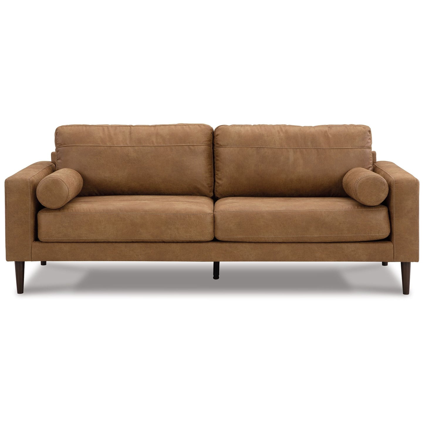 Small-scale style, tailored to perfection. This sofa echoes retro aesthetics with warm caramel faux leather, while its ultra-linear silhouette incorporates a contemporary edge. Versatile in form and function, the seat suits styles from modern boho to transitional. And its size helps you to confidently curate your compact space without sacrificing comfort (or your budget).