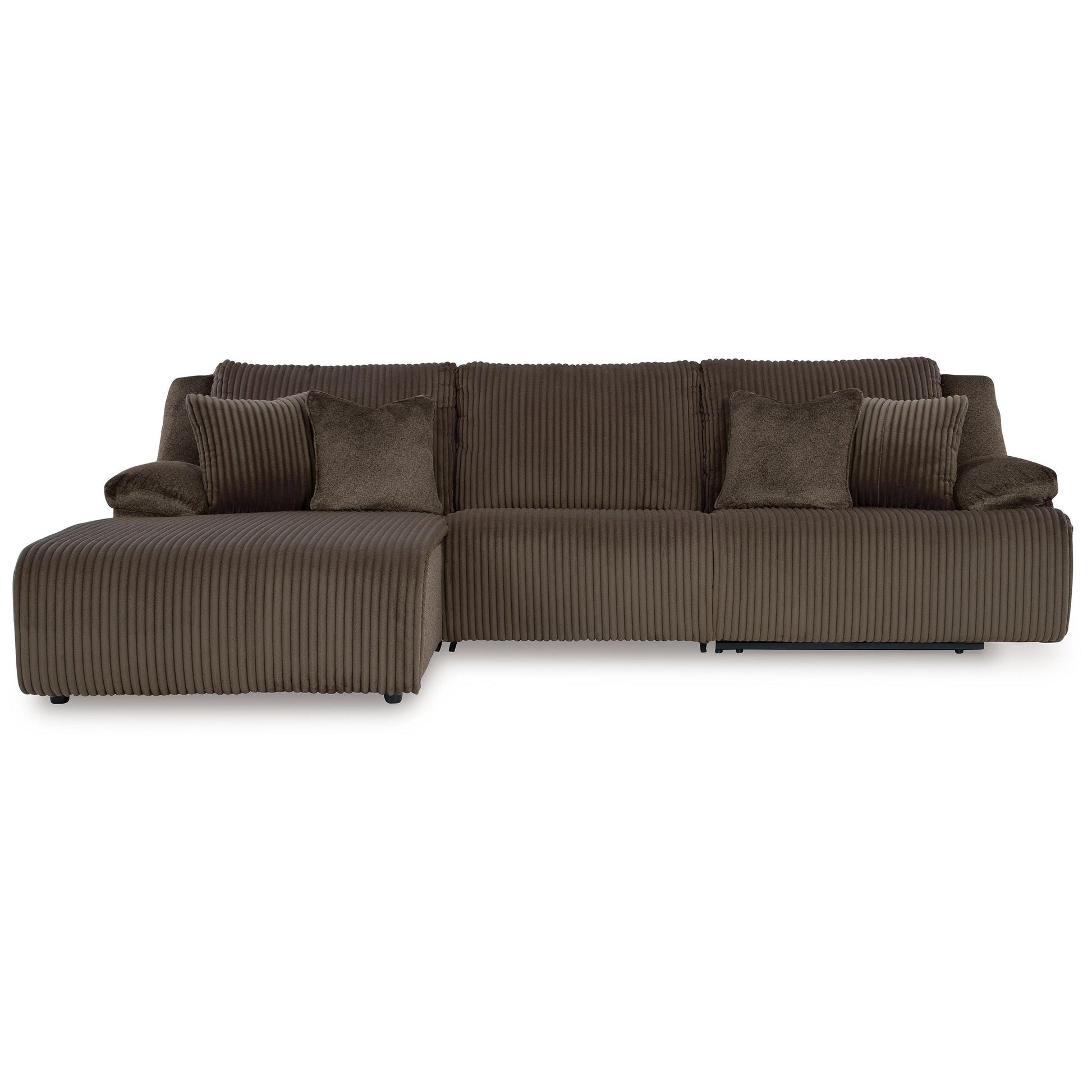 Experience unparalleled comfort with this reclining sectional with chaise. It’s a stylish and invitingly soft look—made all the more appealing by cozy corduroy cushions that feel great and add a touch of texture. The rich chocolate brown upholstery effortlessly blends into your decor, making it a gorgeous addition to your home. So sit back and unwind in this spacious set, perfect for gatherings with friends and family.